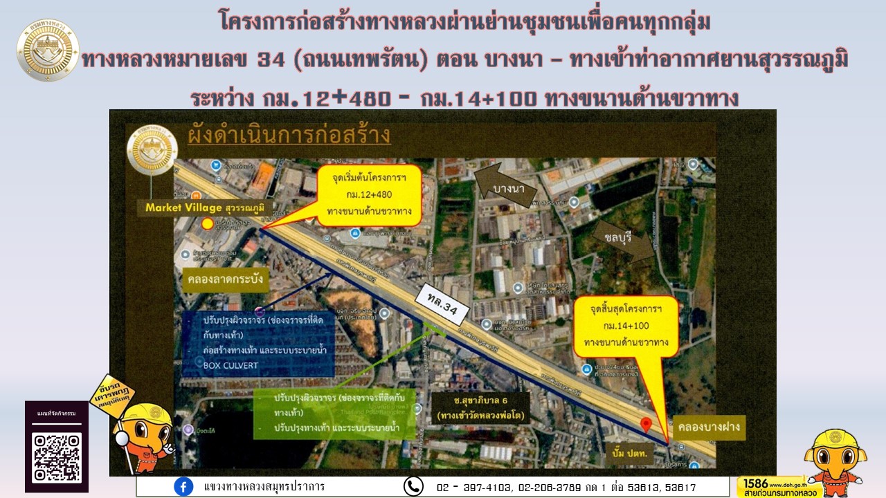 ด้วยแขวงทางหลวงสมุทรปราการ (กรมทางหลวง) ได้รับการจัดสรรงบประมาณดำเนินการก่อสร้างโครงการก่อสร้างทางหลวงผ่านย่านชุมชนเพื่อคนทุกกลุ่ม ทางหลวงหมายเลข 34 (ถนนเทพรัตน) ตอน บางนา - ทางเข้าท่าอากาศยานสุวรรณภูมิ ระหว่าง กม.12+480 - กม.14+100