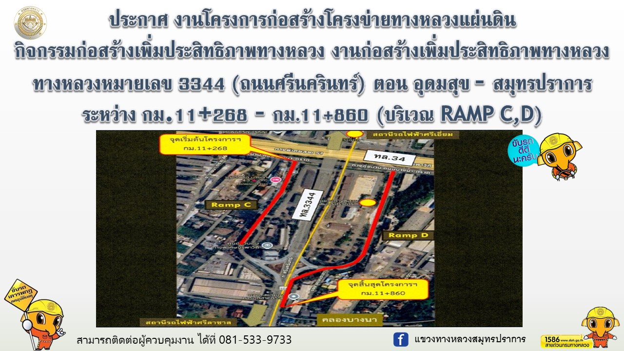 งานโครงการก่อสร้างโครงข่ายทางหลวงแผ่นดิน กิจกรรมก่อสร้างเพิ่มประสิทธิภาพทางหลวง งานก่อสร้างเพิ่มประสิทธิภาพทางหลวง ทางหลวงหมายเลข 3344 (ถนนศรีนครินทร์) ตอน อุดมสุข - สมุทรปราการ ระหว่าง กม.11+268 - กม.11+860 (บริเวณ RAMP C,D)