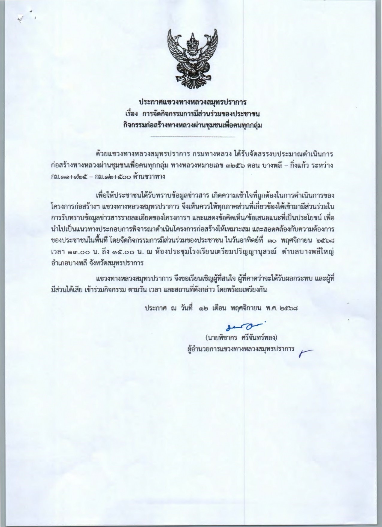 แขวงทางหลวงสมุทรปราการ (กรมทางหลวง) ขอเชิญประชาชนเข้าร่วม กิจกรรมการมีส่วนร่วมของประชาชน ตามที่ได้รับการจัดสรรงบประมาณดำเนินการก่อสร้างก่อสร้างทางหลวงผ่านย่านชุมชนเพื่อคนทุกกลุ่ม